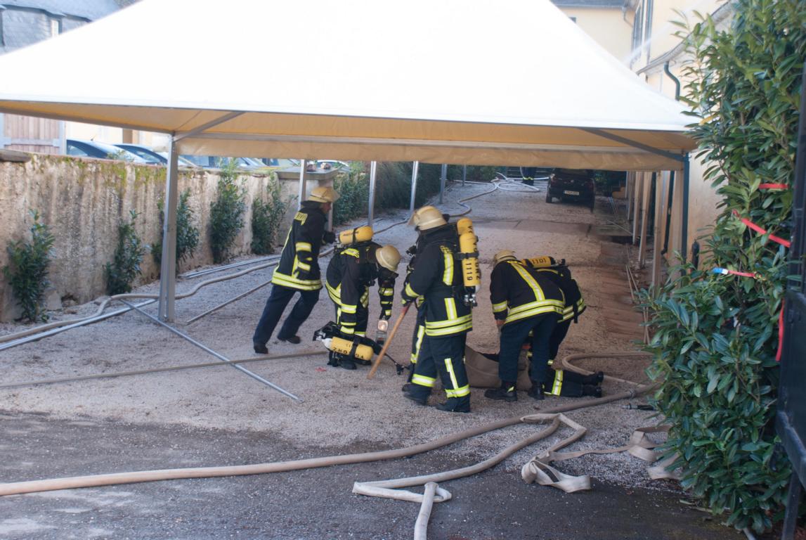 Am Samstagmittag kurz nach 14 Uhr heulten in Oberemmel, Kommlingen, und im Tälchen die Sirenen. Angenommen wurde ein Gebäudebrand in der Agritiusstraße beim Weingut "von Hövel" mit eingeschlossenen Personen.Die Feuerwehr Oberemmel übernahm sofort die Menschenrettung unter PA und den Außenangriff auf der Gebäudevorderseite. Die Brandbekämpfung auf der Gebäuderückseite übernahm die Fw-Niedermennig.